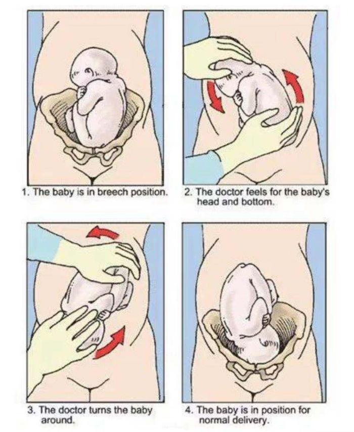 适合做外倒转的情况孕周:36~38周(此时胎儿大小适中,羊水量充足,操作空间较好,转位后不易再转回臀位);