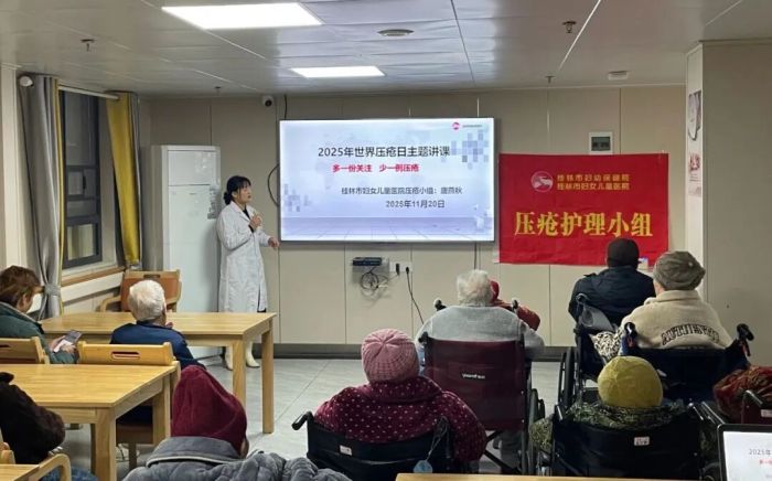 每年11月第三个星期四是“世界压疮预防日”,今年的主题是“用心守护,压疮止步”。为提升人们(尤其是老年群体)对压力性损伤(俗称“压疮”)的预防意识,桂林市妇幼保健院压疮护理小组联合多学科专家团队开展“捍卫皮肤健康,与您并肩同行”系列活动,通过专家义诊和走进清风护理中心开展科普讲座等活动,将专业关怀送到最需要的老年群体身边。