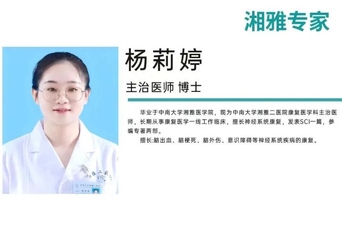 为进一步延伸优质康复医疗服务,让更多患者在家门口即可享受湘雅顶尖康复医疗服务,即日起,中南大学湘雅二医院杨莉婷博士固定于每周三在中南大学湘雅二医院桂林医院南门社区卫生服务中心(位于桂林市环城西二路铁西一里4号,以下简称南院)康复医学科开展业务查房、临床诊疗与技术指导,聚焦脑出血、脑梗死、脑外伤、意识障碍等神经系统疾病,为患者提供精准评估与个性化康复方案。