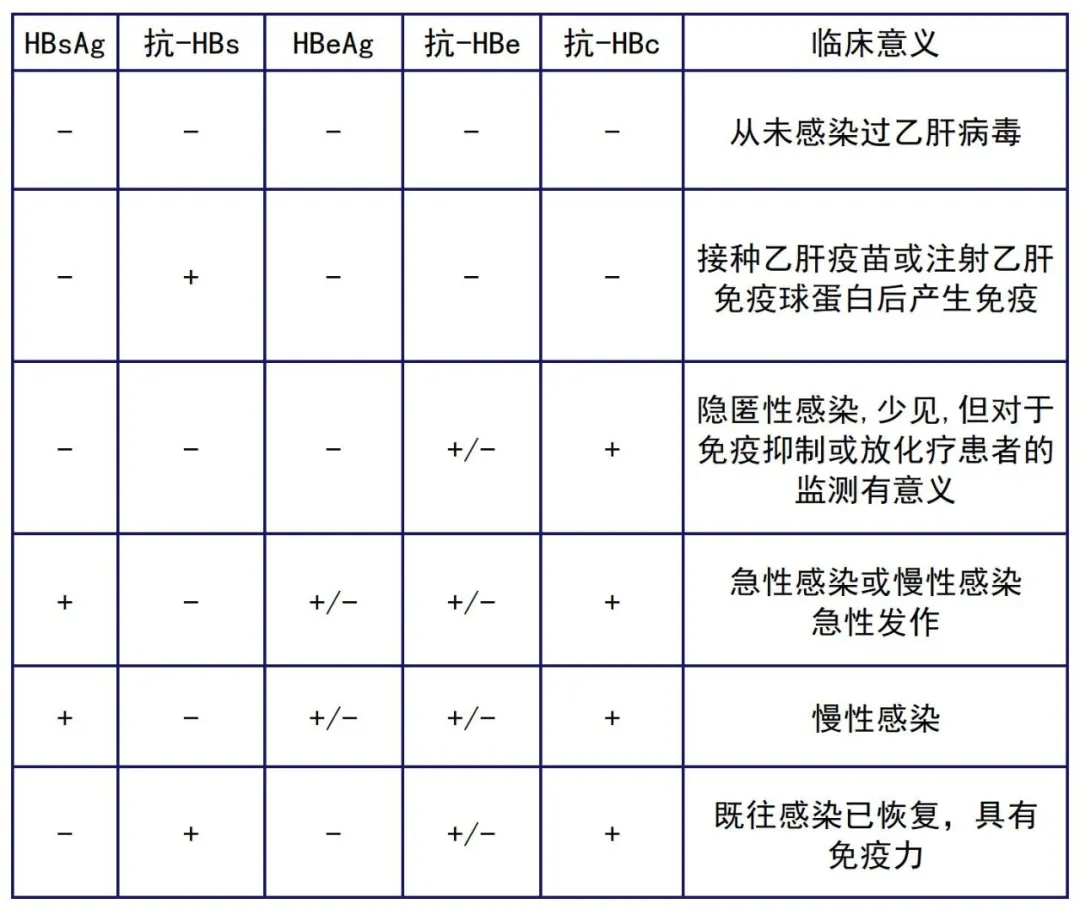 乙肝病毒感染血清学标志物,就是我们平常所说的“乙肝两对半”。“乙肝两对半”检测结果的临床意义如下。