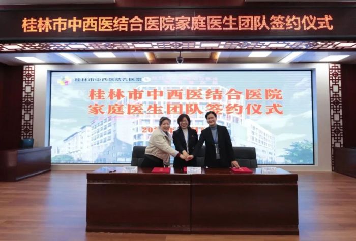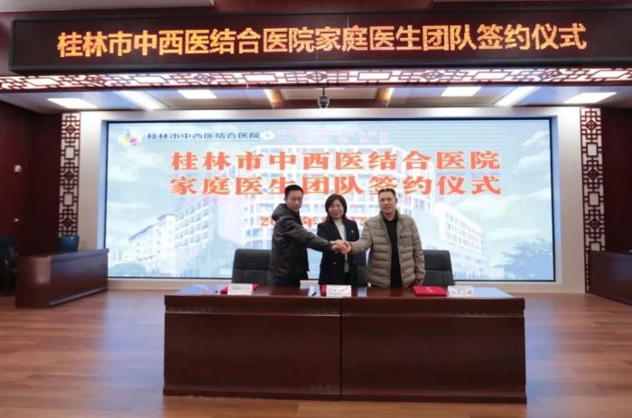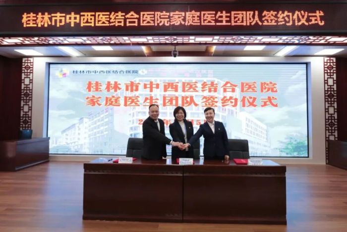 在所有参会人员的共同见证下,桂林市中西医结合医院分别与七星社区卫生服务中心、东江社区卫生服务中心和桂林华侨医院,以及所辖的社区卫生服务站和村卫生室的家庭医生签约服务团队代表签署了合作协议,为“1+1+1”家庭医生团队的高效运行提供制度保障,也为优质医疗资源下沉基层搭建起稳固桥梁,标志着区域医疗协作迈入了责任共担、管理协同、服务联动的新阶段。