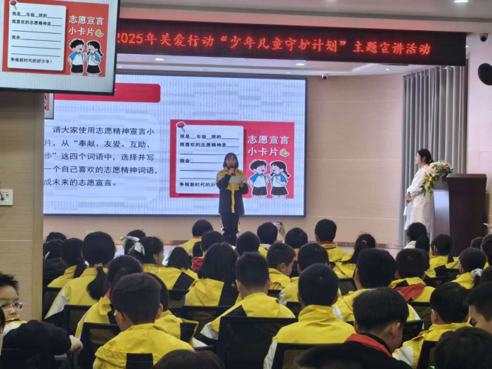 在二年级各班教室,宣讲员以“管道建设工程师”为主题,讲解管道运输知识,开展“管道设计”互动游戏。孩子们分组协作,用彩色拼插积木搭建管道模型,在动手实践中理解管道布局原理,沉浸式体验工程师的工作乐趣。在小学阶梯教室,宣讲员给全体五年级学生开展“我的祖国我奉献”主题宣讲,让爱国情怀和安全知识在校园落地生根。宣讲员发放“志愿宣言小卡片”,引导孩子们写下心中的志愿精神与行动承诺。活动中,多名小学生走上讲台,大声朗读自己的志愿卡片,稚嫩却坚定的话语感染了在场师生。互动问答环节里,小学生围绕“爱国奉献”与“管道保护”主题提出问题,宣讲员逐一细致解答。