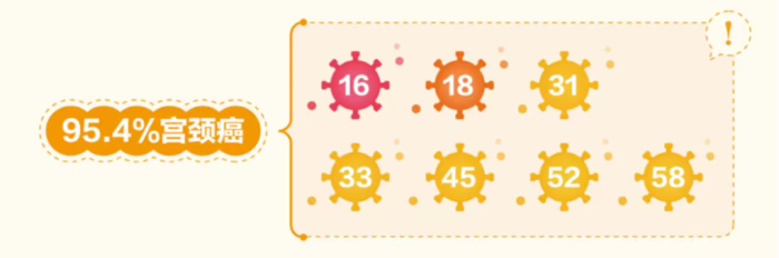 •高危型(导致宫颈癌“主力军”):16、18、31、33、45、52、58型,95.4%宫颈癌风险跟它们有关;