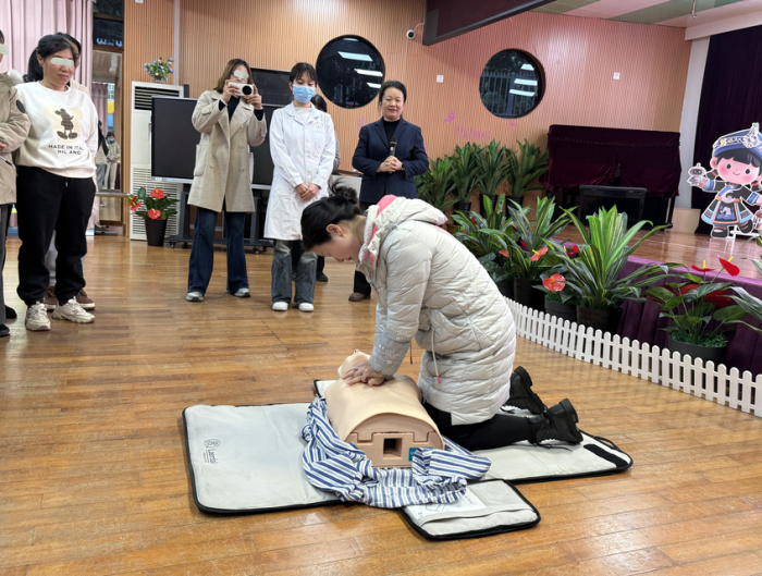 随后,副主任医师肖健楠借助心肺复苏模型,开展了沉浸式急救技能培训。她系统演示了儿童心肺复苏的操作流程,重点分解了评估环境、呼叫求助、胸外按压等关键步骤。在她的指导下,教师们轮流上前进行实操练习。肖健楠医师在培训中强调,急救技能是每一位教育工作者都应掌握的‘生命保险’,在专业救援到达前,规范及时的现场处置能为孩子赢得宝贵的生机。”