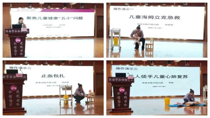 培训班特别邀请桂林市妇幼保健院儿童保健专家及桂林市机关幼儿园教师进行授课,通过专题讲解与实操演示相结合的方式,系统介绍了“五小”问题的识别与管理、儿童单人徒手心肺复苏、止血包扎、海姆立克急救法等关键内容。培训全程,全体学员始终保持高昂的学习热情,专注聆听、认真记录,对于各位专家的精彩授课,学员们给予高度评价,纷纷表示此次学习收获颇丰、受益匪浅。