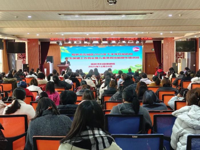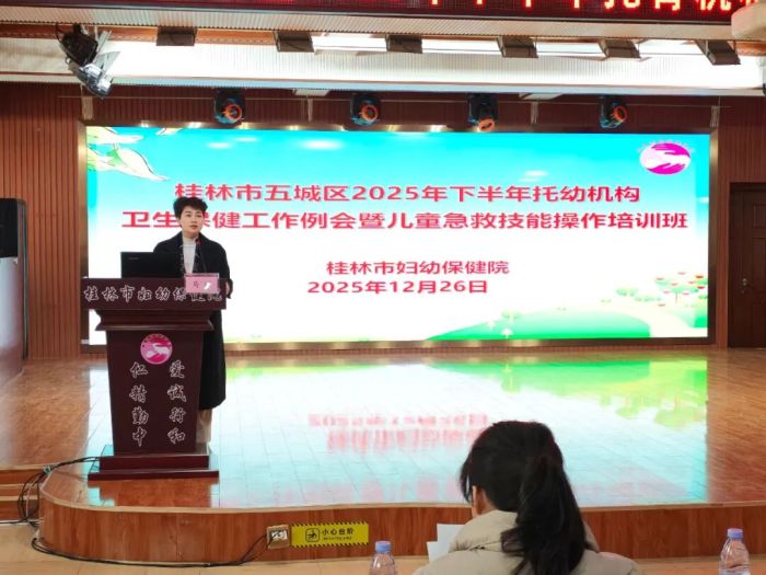 为贯彻落实上级的文件精神,树立托幼机构卫生保健人员对园内“五小”问题儿童健康管理的重视意识,提高托幼机构卫生保健人员儿童意外伤害的急救操作能力,12月26 日下午,由桂林市妇幼保健院主办的桂林市五城区2025年下半年托幼机构卫生保健工作例会暨儿童急救技能操作培训班在医院门诊六楼大会议室举行,来自桂林市五城区托幼机构卫生保健人员共183人参加会议,桂林市妇幼保健院副院长马丽出席开班仪式并致辞。