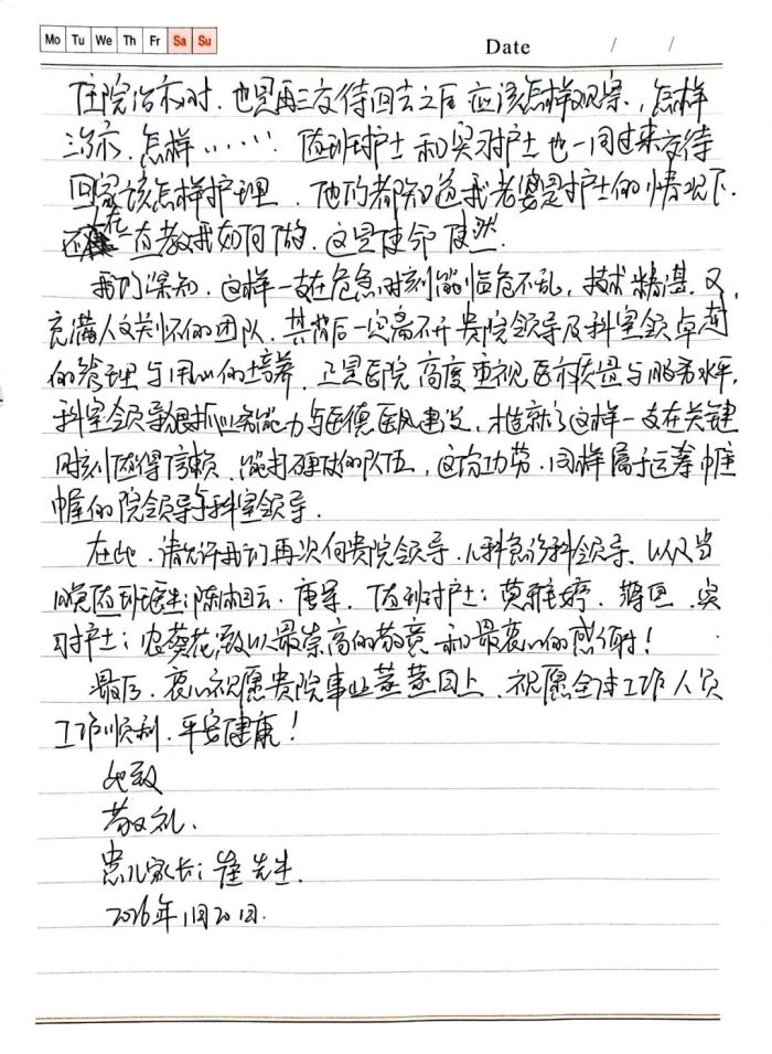 我们深知,这样一支在危急时刻能临危不乱,技术精湛,又充满人文关怀的团队。其背后一定离不开贵院领导及科室领导卓越的管理与用心的培养,正是医院高度重视医疗质量与服务水平。科室领导狠抓业务能力与医德医风建设,才造就了这样一支在关键时刻值得信赖,能打硬仗的队伍,这份功劳,同样属于运筹帷幄的院领导与科室领导.......”