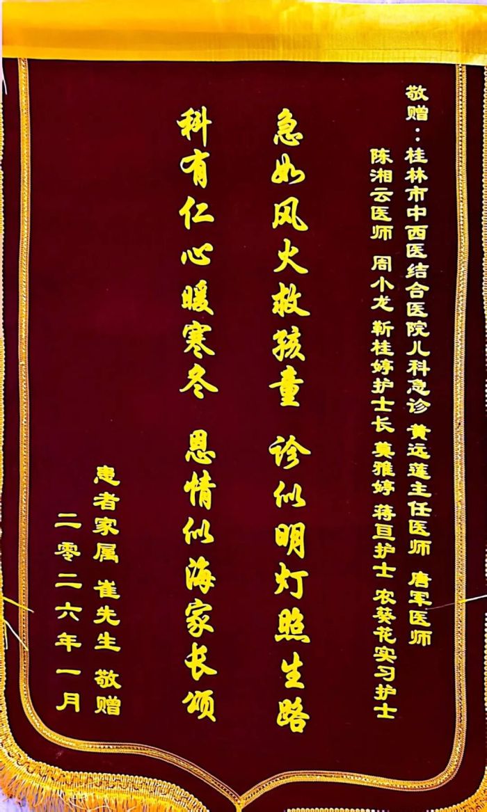 事后,患儿父亲书写了感谢信并制作了一面鲜红的锦旗送至医院,上面写着“急如风火救孩童,诊似明灯照生路,科有仁心暖寒冬,恩情似海家长颂”,以表达对儿科医护团队的深深感激。这份荣誉不仅是对儿科医护人员专业能力的认可,更是对他们仁心仁术的最好褒奖。