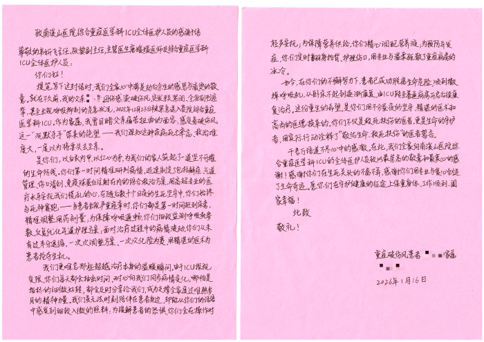 面对这份肯定,科室表示,家属的感谢既是对过往工作的认可,更是对今后工作的鞭策。未来,综合重症医学科将继续坚持人民至上、生命至上的理念,不断提升急危重症救治能力,强化人文关怀与沟通,为患者构建更加安全、温暖的生命防线。