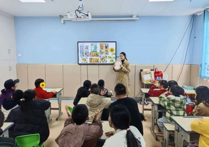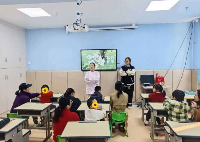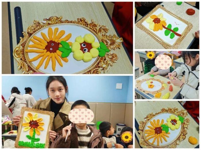 活动现场气氛温馨而专注。广西师范大学工艺美术专业的教师们精心准备了丰富的材料,以专业又充满亲和力的方式,逐步引导孩子们进入艺术创作的世界。在树叶拓印环节,孩子们认真挑选叶片,在老师和家长的辅助下,小心翼翼地为叶片涂色、拓印,白纸上渐渐浮现出色彩柔和、叶脉清晰的图案,每一幅都是独一无二的自然笔记。随后进行的胶泥向日葵制作中,孩子们充分发挥想象力,通过揉、搓、捏、贴等动作,将彩色胶泥变成一朵朵向阳而生的花朵,生动展现了个体的创意与情感表达。
