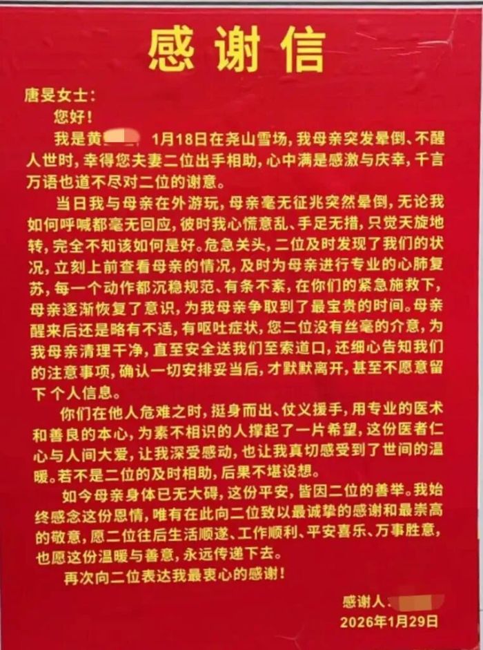 事后,获救老人家属黄女士满怀感激,写下一封情真意切的感谢信。信中写道:“危急关头,二位及时发现了我们的状况……及时为母亲进行专业的心肺复苏,每一个动作都沉稳规范、有条不紊,为我母亲争取到了最宝贵的时间。”“你们在他人危难之时,挺身而出、仗义援手,用专业的医术和善良的本心,为素不相识的人撑起了一片希望……让我真切感受到了世间的温暖。”字里行间,充满了对唐旻及其家人义举的深深谢意。