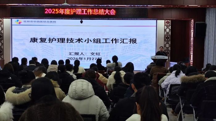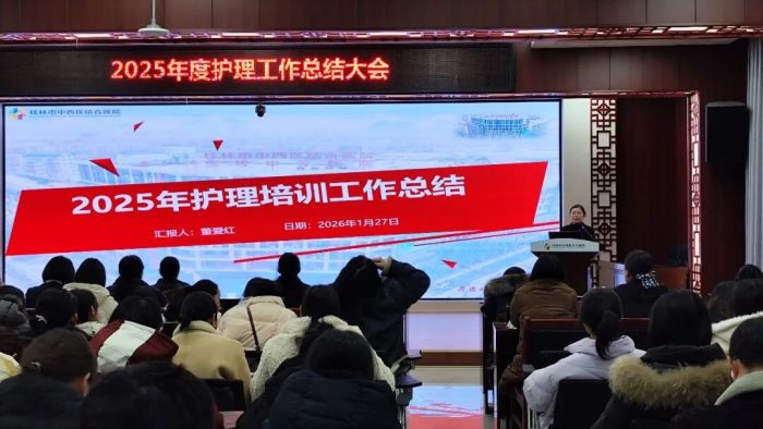 1月27日,桂林市中西医结合医院护理部召开2025年度护理工作总结大会。副院长靳清出席会议并讲话,会议由护理部主任龚璇主持。各科室护士长、副护士长及护理骨干等120人参加会议。