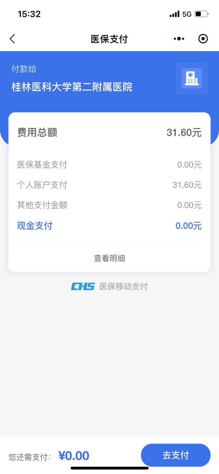 • 桂林医科大学第二附属医院微信医保支付目前已支持门诊统筹、门诊特殊慢性病、门诊特药统筹、门诊生育等费用结算。