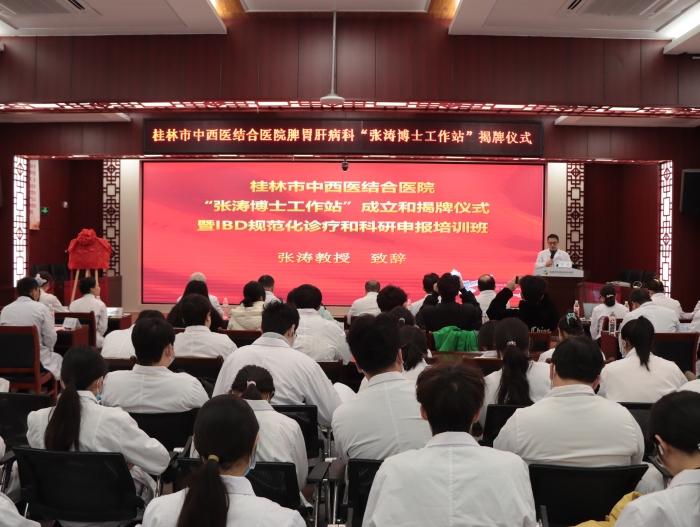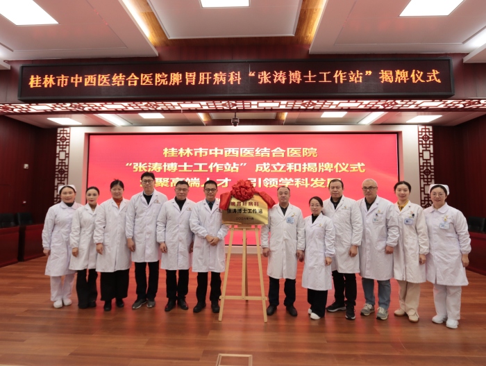 1月31日,桂林市中西医结合医院举行了首个“博士工作站”签约揭牌仪式,脾胃肝病科“张涛博士工作站”正式成立。张涛博士是医学博士后、正高级专家教授、全国优秀中医临床人才。揭牌仪式由桂林市中西医结合医院副院长陈明主持,相关部门负责人参加。