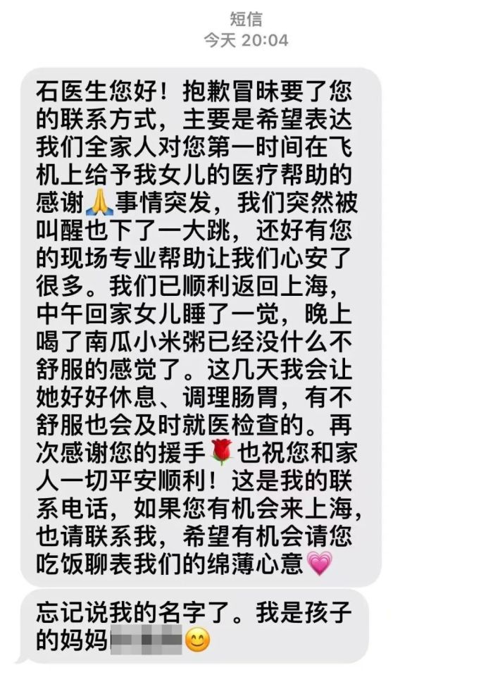 面对高空有限的医疗条件与突发险情,石谊联医生没有丝毫犹豫。她深知,每一次挺身而出都是对生命的守护。作为深耕肺病与老年病领域的资深专家,救死扶伤早已刻入职业本能。施救过程中,她一边稳定患者体征,一边安抚家属情绪,与机组紧密协作,持续守护直至患者状况好转、航班安全落地,面对乘客、家属及机组的连声致谢,她淡然表示:“救死扶伤是医生的天职,无论身在何处,履行职责都是本能。”并在离开之际交代了相关的注意事项。