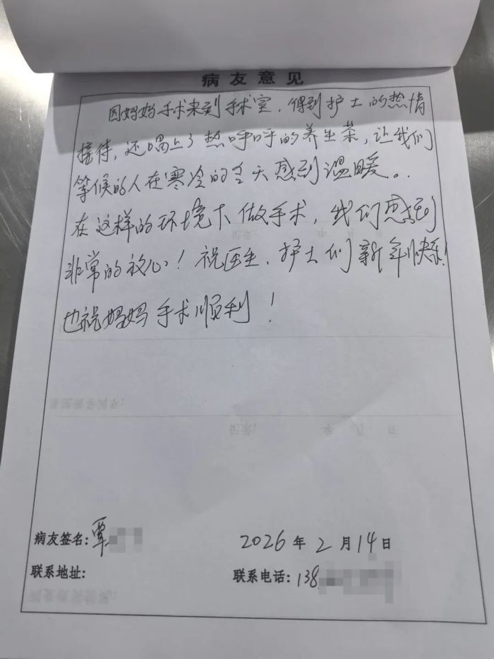 2026年马年春节将至,当万家团圆之时,仍有患者在手术台上与病魔抗争,家属在门外焦急守候。为缓解等候焦虑,桂林市中西医结合医院手术麻醉科在春节前夕推出“人文关怀角”,用一杯热茶、一份福袋、一本留言簿,传递别样年味与温情。