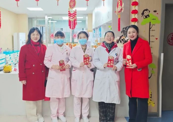 “大家辛苦了!这是你们的‘敬业福’!”在产科,院领导向刚为产妇接生完的医护团队送上新年祝福。据统计,除夕至初一期间,全院超400名医护人员在岗值守。截止发稿时间,产科迎来了7名“春节宝宝”。