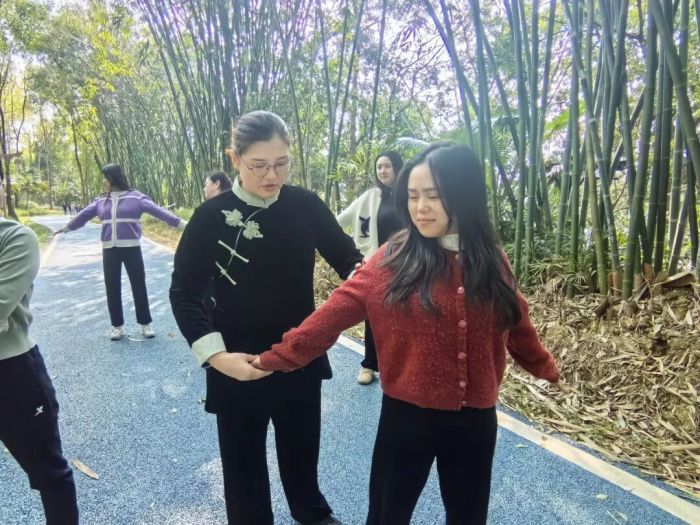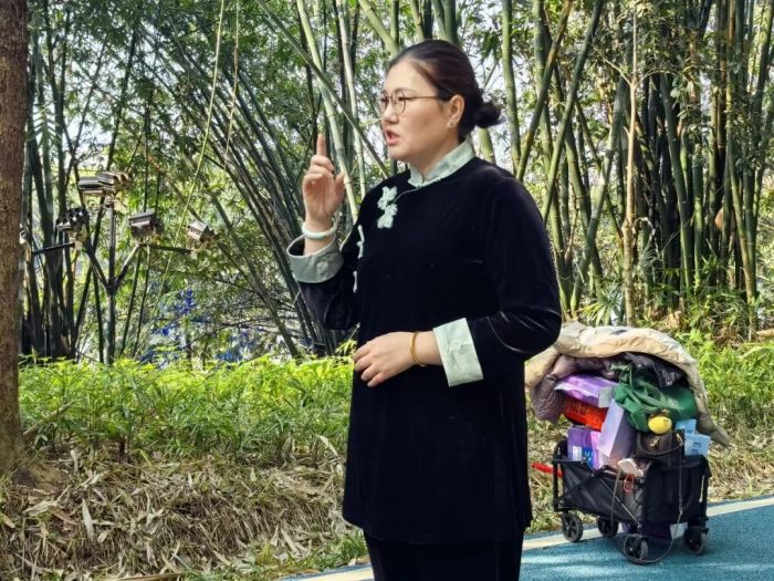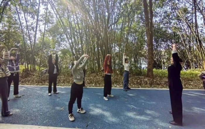 活动首站选在风景秀丽的訾洲公园。春日暖阳下,园内郁金香竞相绽放,一片幽静的竹林成为了此次推广活动的天然课堂。医院客服部组成的推广团队身着统一服装,在斑驳光影的竹林间缓缓起势,为游园市民带来了一场行云流水的八段锦展示。