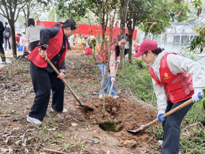 植树现场,来自南溪山医院青年文明号集体的青年志愿者们热情高涨,挥锹铲土、扶苗填坑、培土浇水,大家配合默契,各个环节衔接有序,现场呈现出一派热火朝天的劳动景象。在大家的共同努力下,一株株新绿昂然挺立,为春日的漓江之畔增添了勃勃生机。