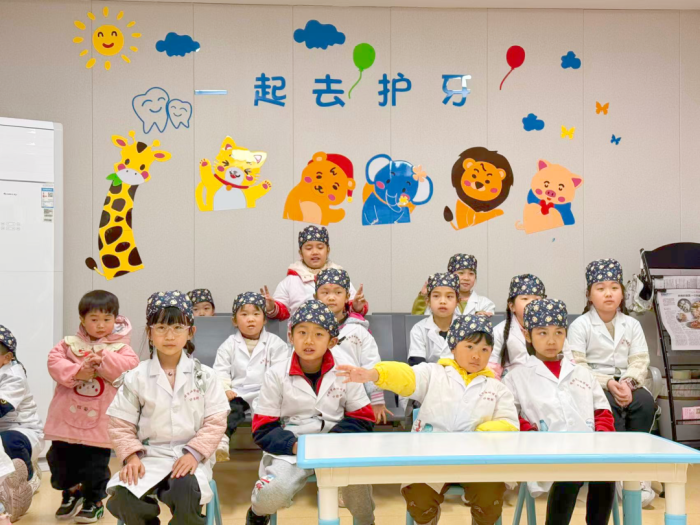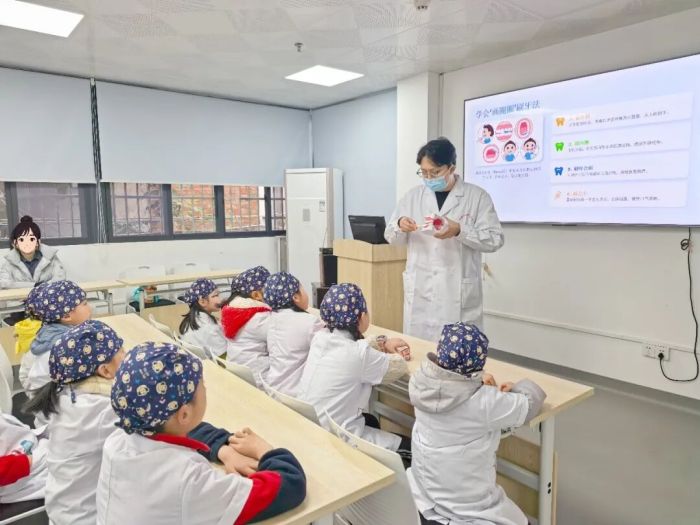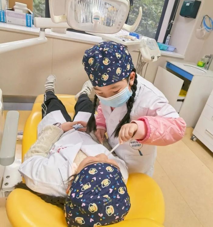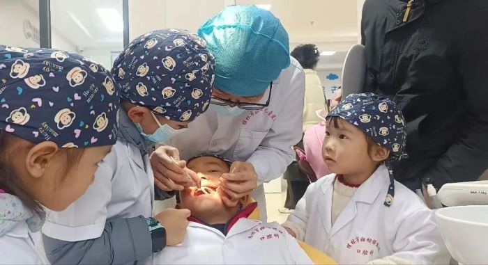 随后的“小小牙医”角色扮演环节,将活动推向了高潮。孩子们穿上迷你白大褂、戴上专属手术帽,化身“小小牙医”,在医师的指导下,两两一组互相进行口腔检查,沉浸式体验牙医的工作流程。从学习使用口腔检查工具,到模拟为同伴检查牙齿,孩子们近距离了解了口腔诊疗的全过程,不仅消除了对看牙的恐惧,更在实践中加深了对口腔健康的认知。