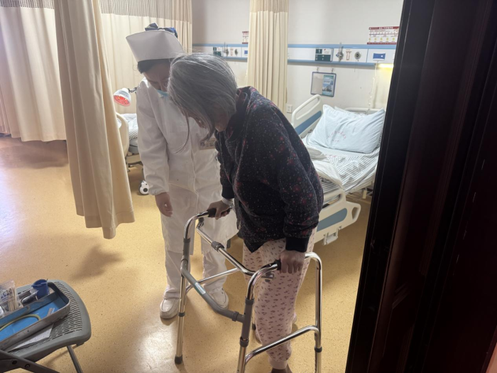 吴雪挺主任团队为汤奶奶实施右侧人工股骨头置换术。凭借20余年丰富的临床经验,手术仅用45分钟便顺利完成。术后第二天,在创伤二科(城中院区)医护团队的专业指导下,汤奶奶便能借助助行器缓慢站立,这一画面让守在病房外的家属激动不已。