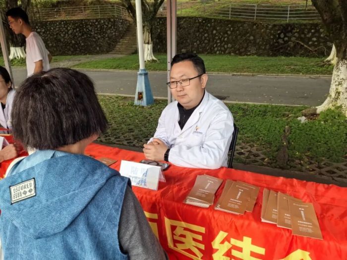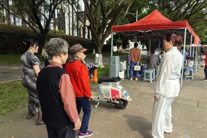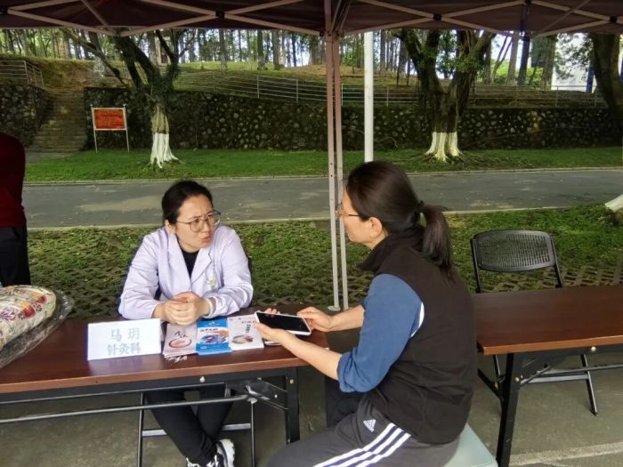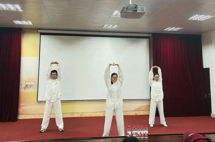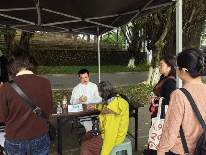 活动内容丰富,涵盖健康讲座、八段锦展演、专家义诊、中医外治体验及中医药文创展示等多个环节。医院健康管理中心(治未病)副主任秦基倡以《中医春季养生》为题,围绕“春养肝、防风邪、调情志、适起居”等中医养生原则进行讲解,并结合高校师生及老年群体常见健康问题提出针对性建议。讲座结束后,医护人员现场展演中医传统养生功法八段锦,并带领参与者亲身体验。