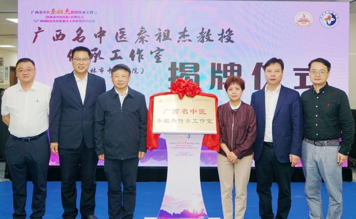 在大家的共同见证下,广西国际壮医医院党委书记、广西名中医秦祖杰教授,桂林市卫生健康委副主任麦浩,桂林市中医医院党委书记唐刚健、院长谭永星,广西国际壮医医院副院长张荣臻、壮医针灸科主任肖敬,共同为“广西名中医秦祖杰教授传承工作室”揭牌。