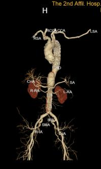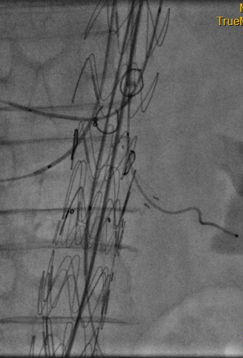 手术团队通过导管导丝操作技术,依次对腹腔干、肠系膜上动脉、双肾动脉进行精准选入并植入支架,成功完成对重要内脏分支动脉的血运重建。最后,一枚大动脉覆膜支架被精准植入胸降主动脉,与主体支架完美衔接,将夹层动脉瘤完全隔绝于血液循环之外,彻底消除破裂风险。术后最终造影结果显示:夹层动脉瘤隔绝彻底,无内漏发生,腹腔干、肠系膜上动脉、双肾动脉等四支血管血流通畅。