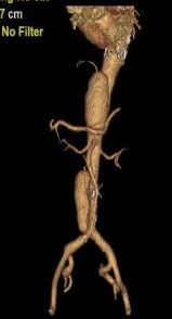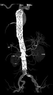 此次因腰部胀痛再次入院,CT检查显示为原胸主动脉支架远端夹层动脉瘤较前进展,且瘤体已非常接近腹腔干、肠系膜上动脉开口及双肾动脉。