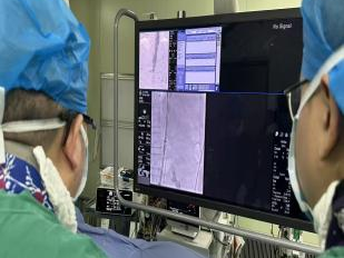 手术当天,团队成员分为两组同步开展操作,一组建立手术通路(右腋动脉及右股动脉),一组改装支架,主体支架经右侧股动脉入路,被精准输送至病变部位,部分释放并顺利展开腹腔干、肠系膜上动脉外分支。
