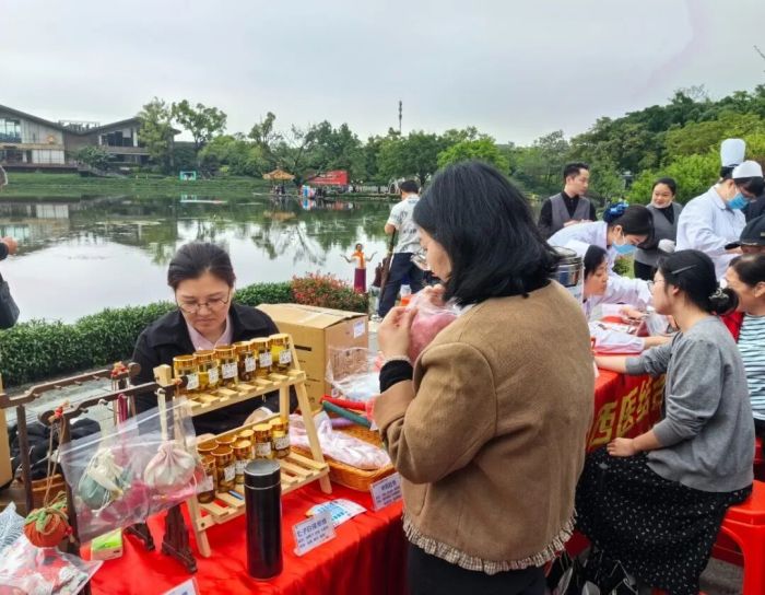 中医药文创展示区成为现场一大亮点。中药肚兜、中药香囊、中药锤、中药枕以及七子白浸泡油等产品,将中医养生智慧融入日常生活,吸引大量市民驻足了解、询问用法。药膳品鉴区同样人气高涨:乌梅汤、椰香四神蛋糕、山楂棒棒糖、海底椰雪梨膏、陈皮红豆芒果豆花……一道道“药食同源”的美味,让群众在品尝中直观感受中医食疗的魅力。