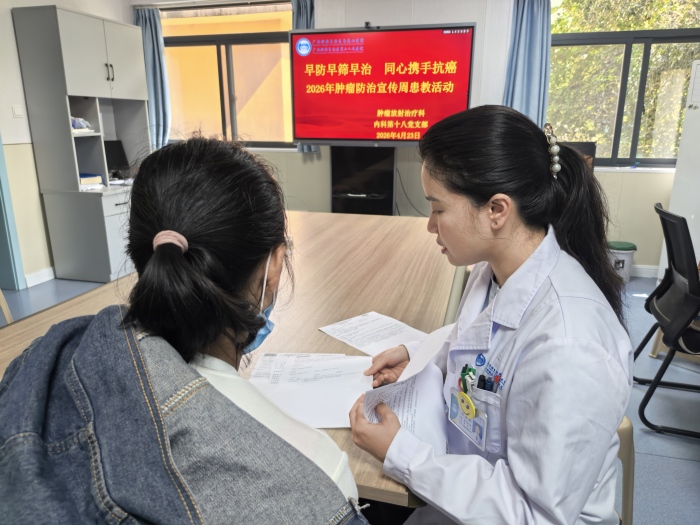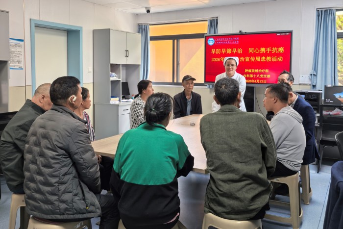 为深入贯彻全国肿瘤防治宣传周工作要求,普及科学规范的肿瘤放射治疗知识,缓解患者及家属抗癌焦虑,搭建医患沟通交流的暖心桥梁,4月23日,广西壮族自治区南溪山医院肿瘤放射治疗科,围绕“早防早筛早治,同心携手抗癌”主题,顺利开展2026年肿瘤防治宣传周专项健康宣教患教会。科室全体医护人员、在院肿瘤患者及家属共同参与本次活动,以专业科普、面对面交流的形式,为肿瘤患者提供全流程诊疗与康复指导。