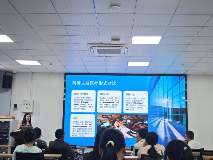 汇报环节,余霞围绕出国期间的学习收获、专业知识提升以及对国外医疗机构运行模式的体会等方面进行了系统汇报。她详细介绍了在英国的学习经历,分享了研修期间所参与的临床实践、实验室科研及学术交流,重点讲述了国外医疗体系在资源配置、服务流程管理及医教研协同等方面的特点与启示。汇报内容紧扣专业实际,既有理论高度,又有实践思考,引发了与会人员的热烈讨论与深入交流。