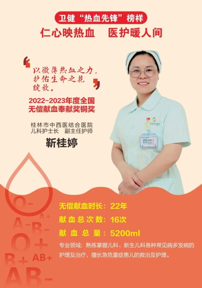 在桂林市中西医结合医院儿科病房,总有一个步履匆匆却沉稳干练的身影。这位戴着细框眼镜、眼神坚定的女性,正是大儿科党支部书记、儿科护士长靳桂婷。22年来,她累计无偿献血16次,总献血量达5200毫升,相当于一个成年人全身的血量。她以“党建红”引领“天使白”,用自身的热血奉献凝聚起大儿科党支部的强大合力,用实际行动诠释着党员的责任与医者的担当,荣获全国无偿献血奉献奖铜奖。